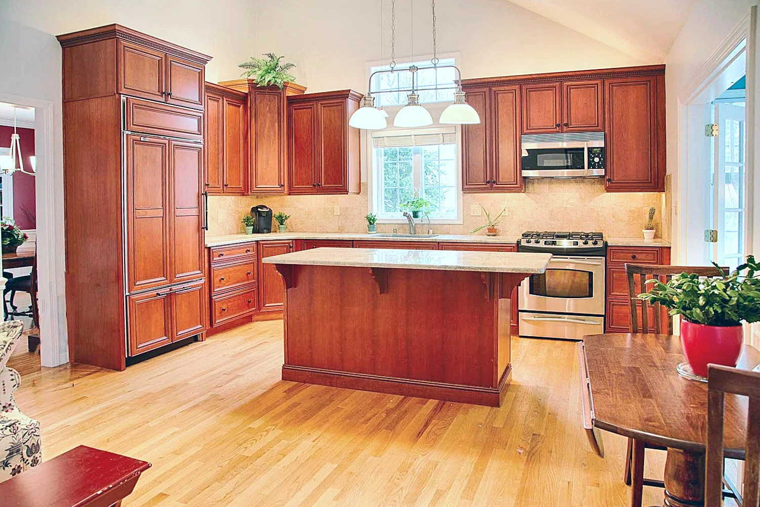 The kitchen wall color is Sherwin Williams Silverpointe, allowing for the warm cherry kitchen cabinets to be noticed. The countertop is granite.