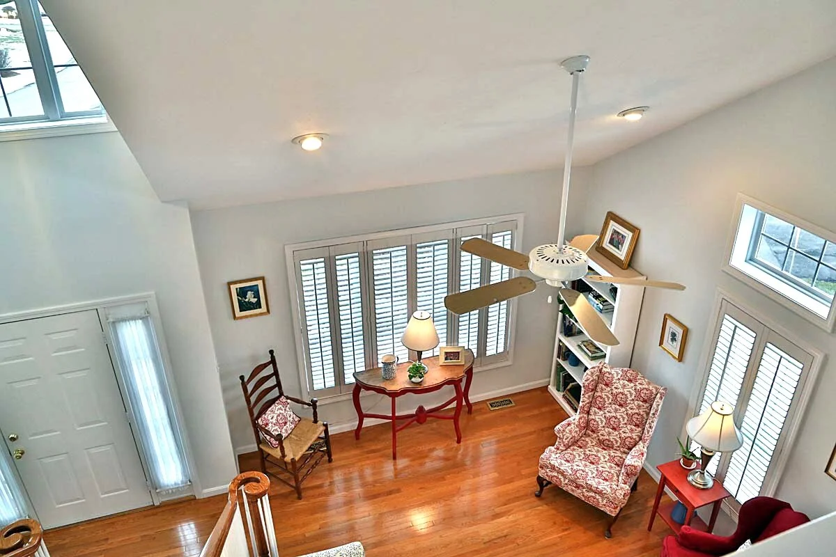 In the foyer, furniture was used to create an inviting entrance. Pictures were utilized throughout the two story wall reducing the monumental feel.