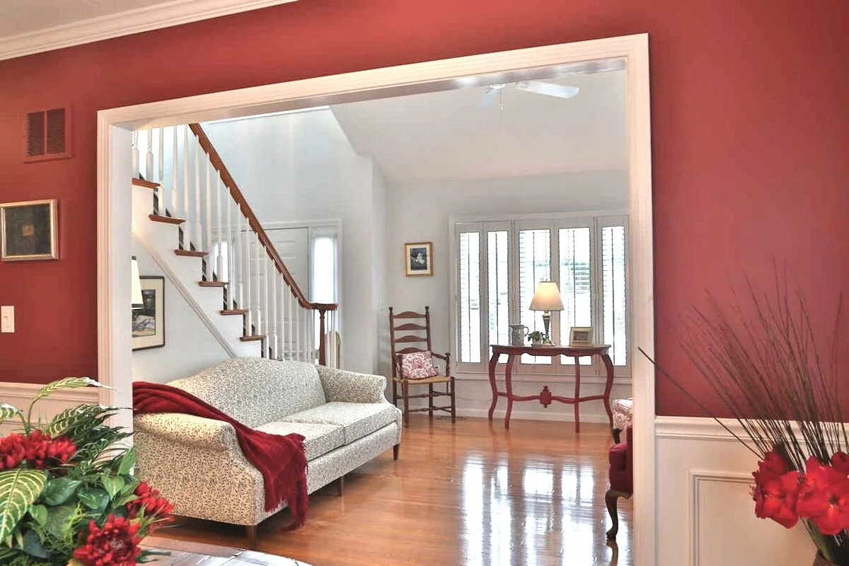The living room wall color was changed to soft white with a hint of blue. The red accents compliment the dining room wall color.