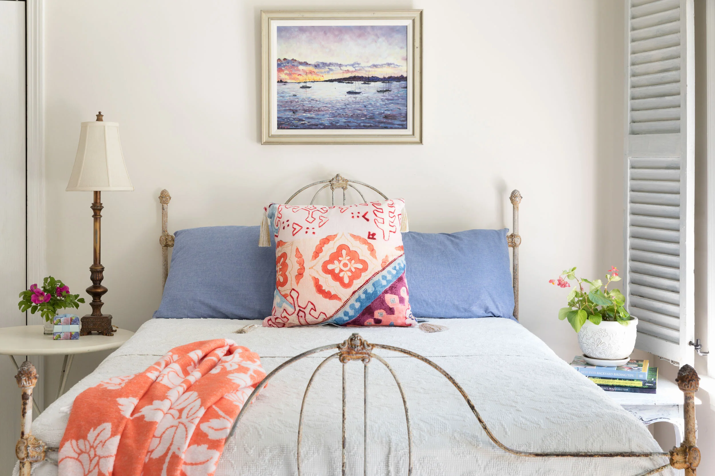 Oil Painting: The inspiration for color in the guest room came from a painting of Chebeague Island, located in Casco Bay Maine and 10 miles from Portland. Jean Byrd, a well know Rockport and Camden artist whose concentration is New England coastal scenery. The purples and blues along with the orange-yellow paint colors inspired accents in the guest bedroom.
