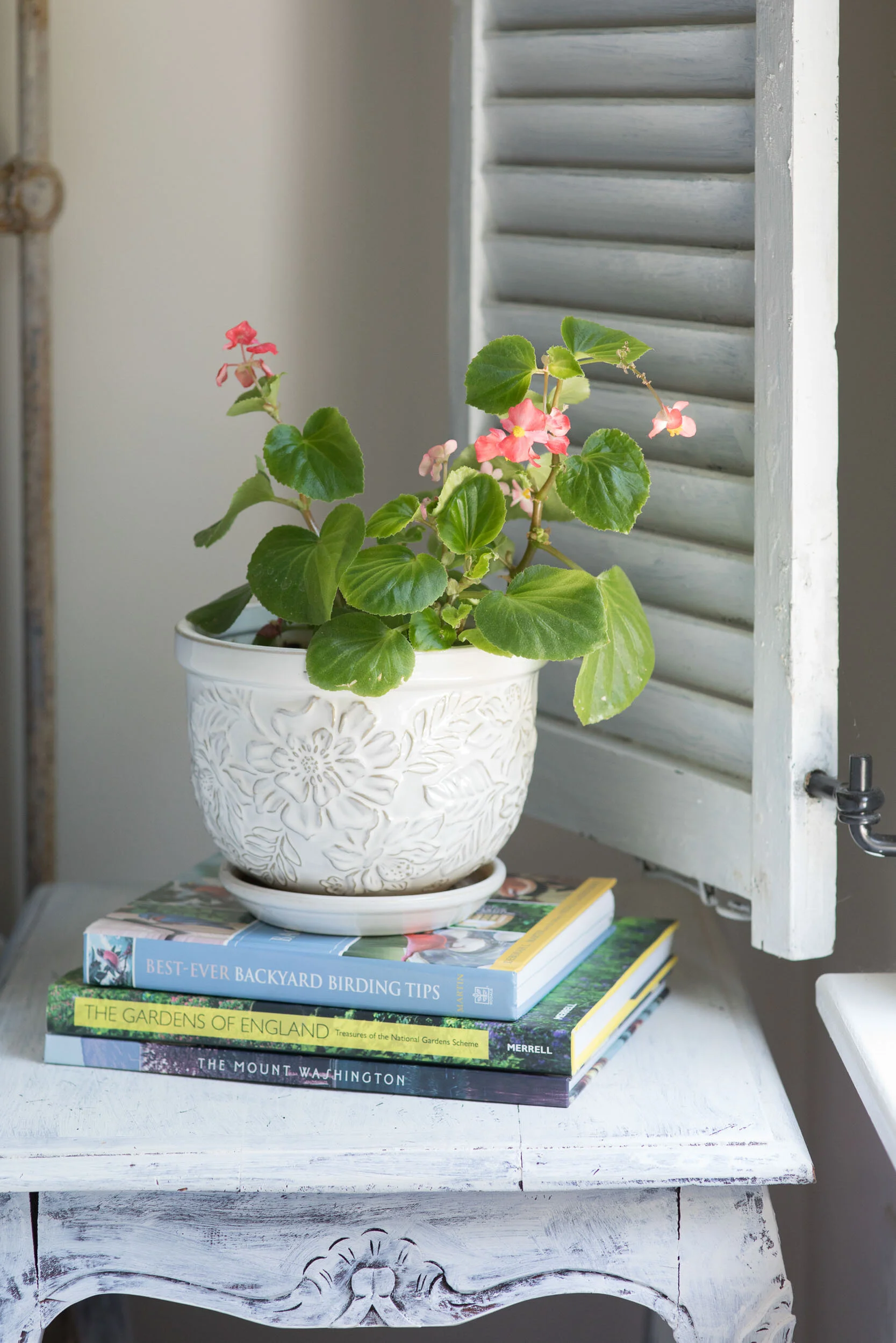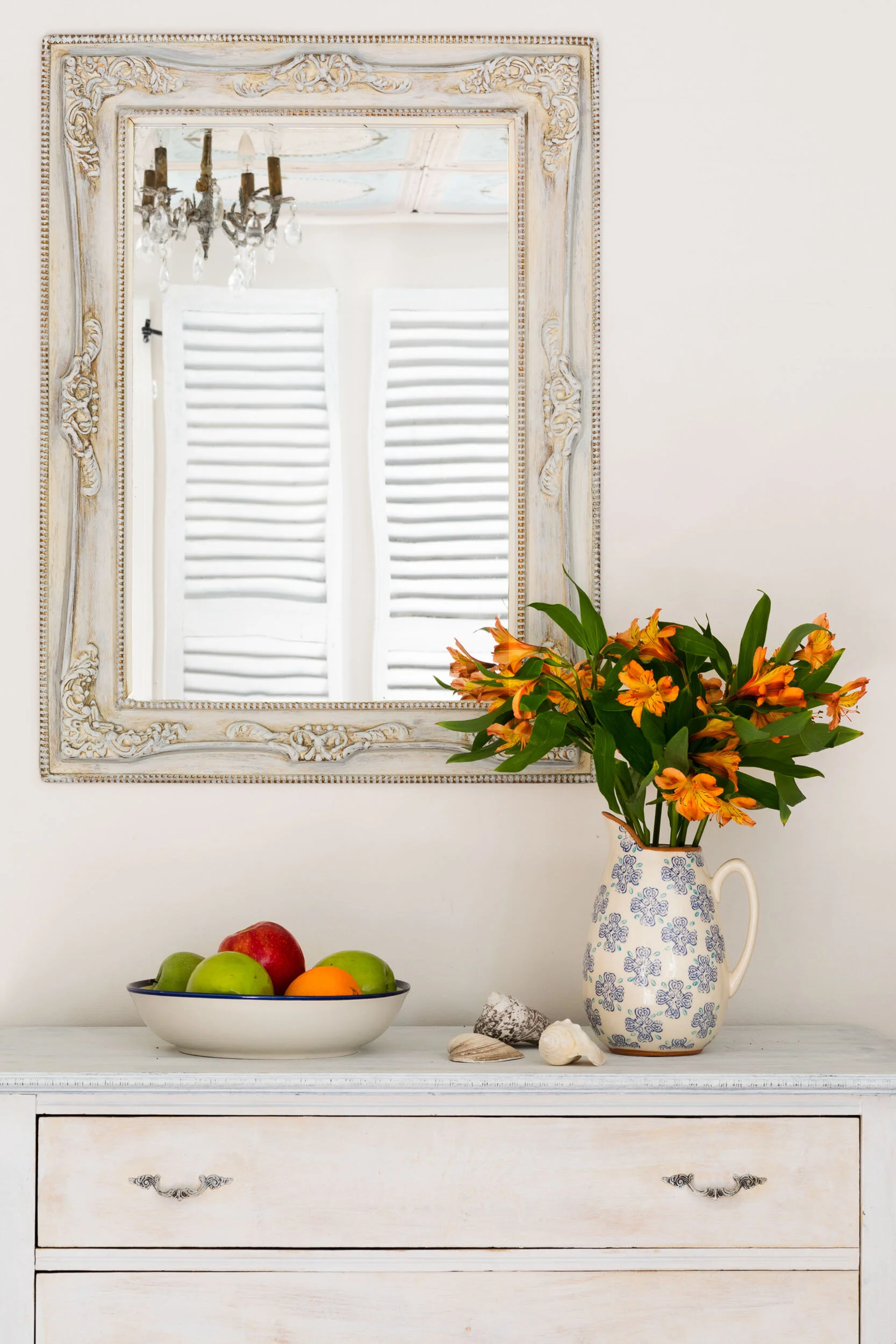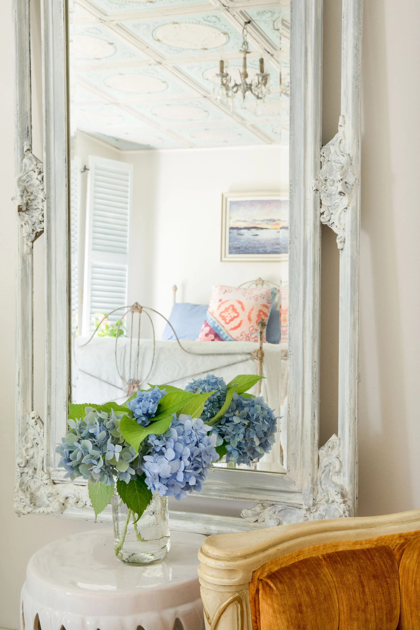 A cozy reading area was created with a vintage French Provincial button tufted orange velvet chair purchased in Manhattan, with antique white finish and gold accent details. Fresh flowers are always present in the guest bedroom from the home’s gardens. Hydrangea cut from hydrangea alley, fresh fruit, fragrant guest soaps, a basket of collected shells, and driftwood shore finds add comfort and charm to this guest room retreat.