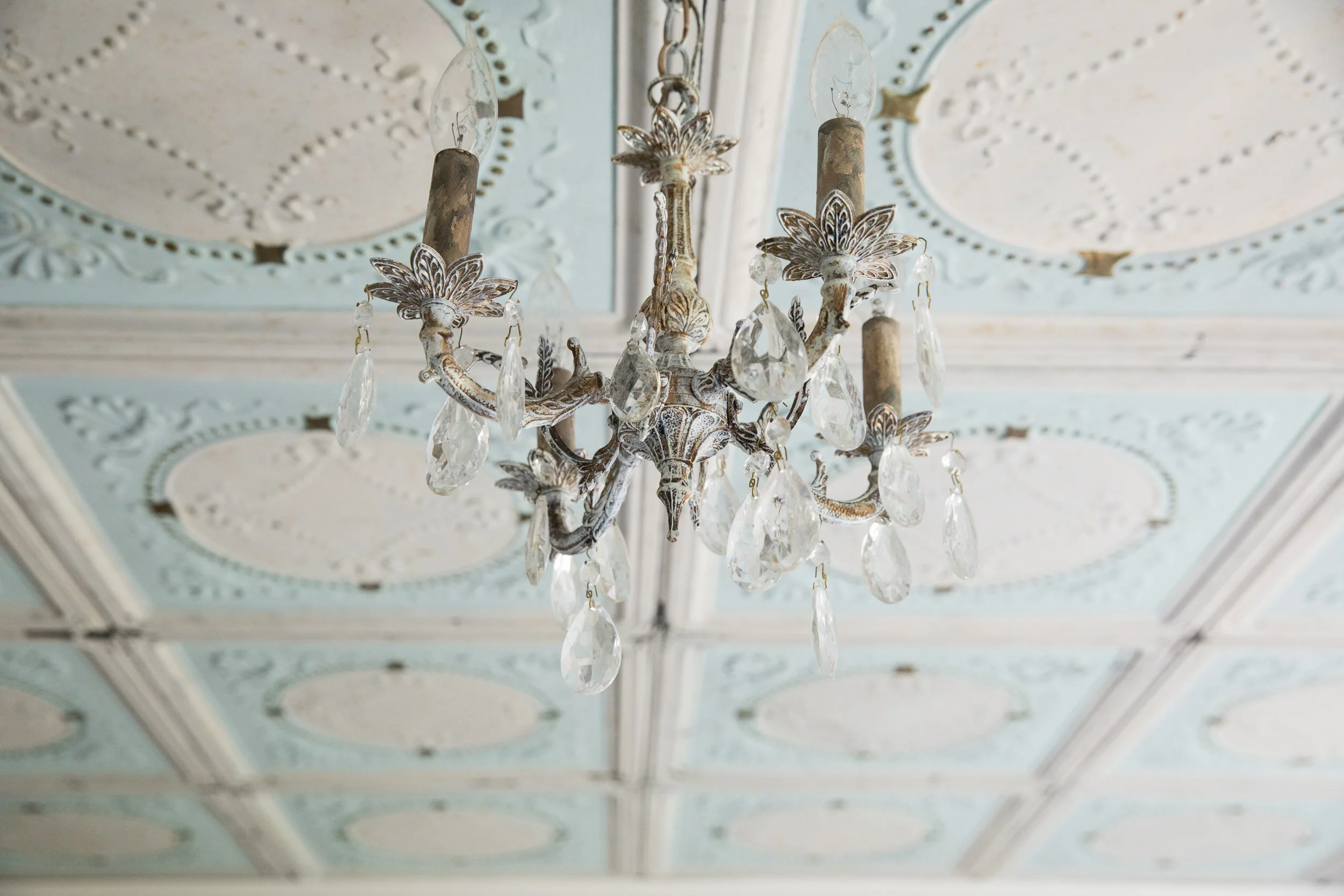 Ceiling: Blue and white tin ceiling tiles were salvaged from an old Greek church in Biddeford, Maine that was being torn down to put up a parking lot.