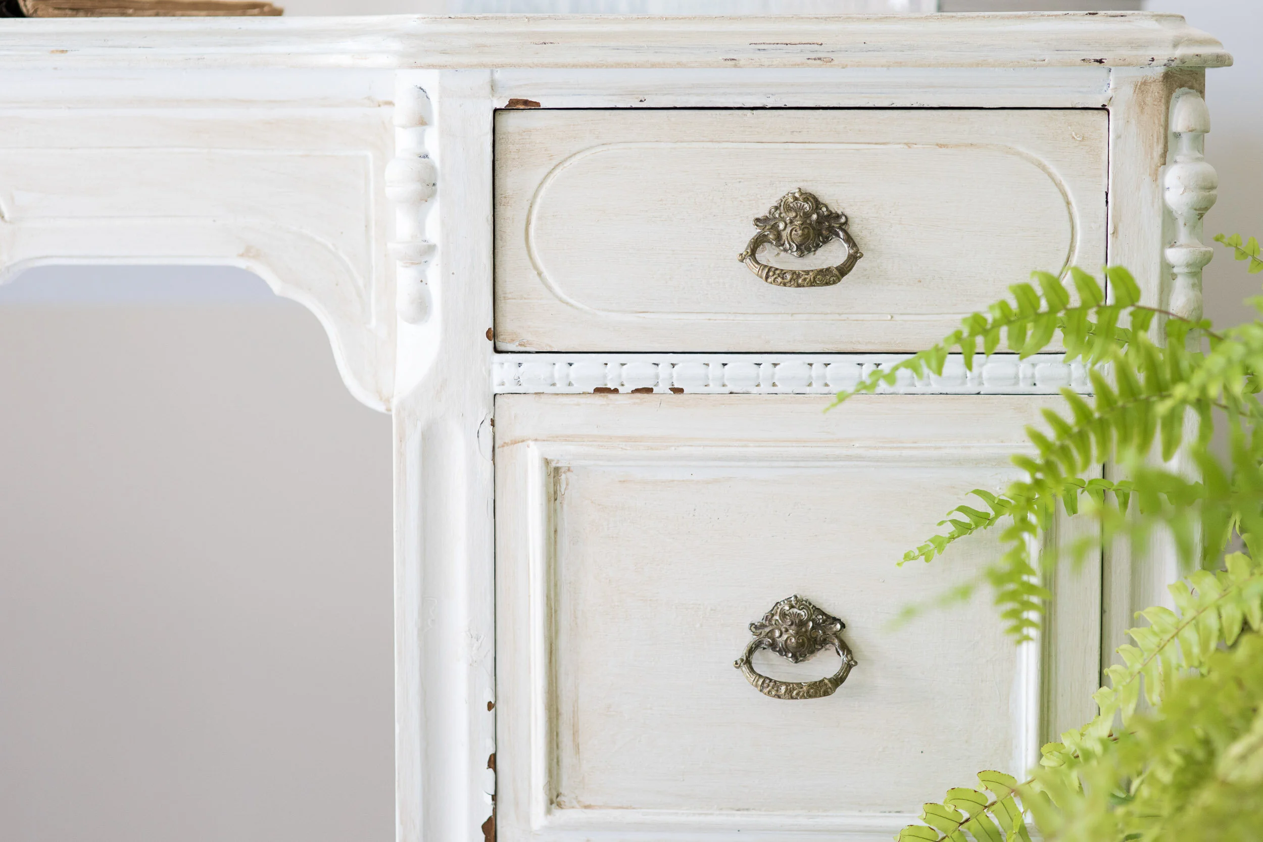 The grandmother’s writing desk which was passed on was originally painted in olive green. A dry brushing technique was applied to the desk to give a distressed lighter feel that would fit in the room. A marble clock was another passed-on piece accented the desk. Above the desk is a set of old photographs of Gloucester and Rockport, Massachusetts. A grandmother’s mirror also hangs proudly above the hand-painted dresser which was also distressed and embellished with detailed brass hand-pulls. A rusted iron side table, another vintage find was painted in off-white and left without a tablecloth to give a more spacious look to the room. Closet door pulls were replaced with a combination of bronze and glass to add a little charm to the existing closet doors that received a fresh coat of white paint. For privacy, exterior vintage shutters were found and added to the inside of the windows. These would allow for a fantastic view of the cove and gardens for guests to enjoy when open and provide privacy when closed at night.