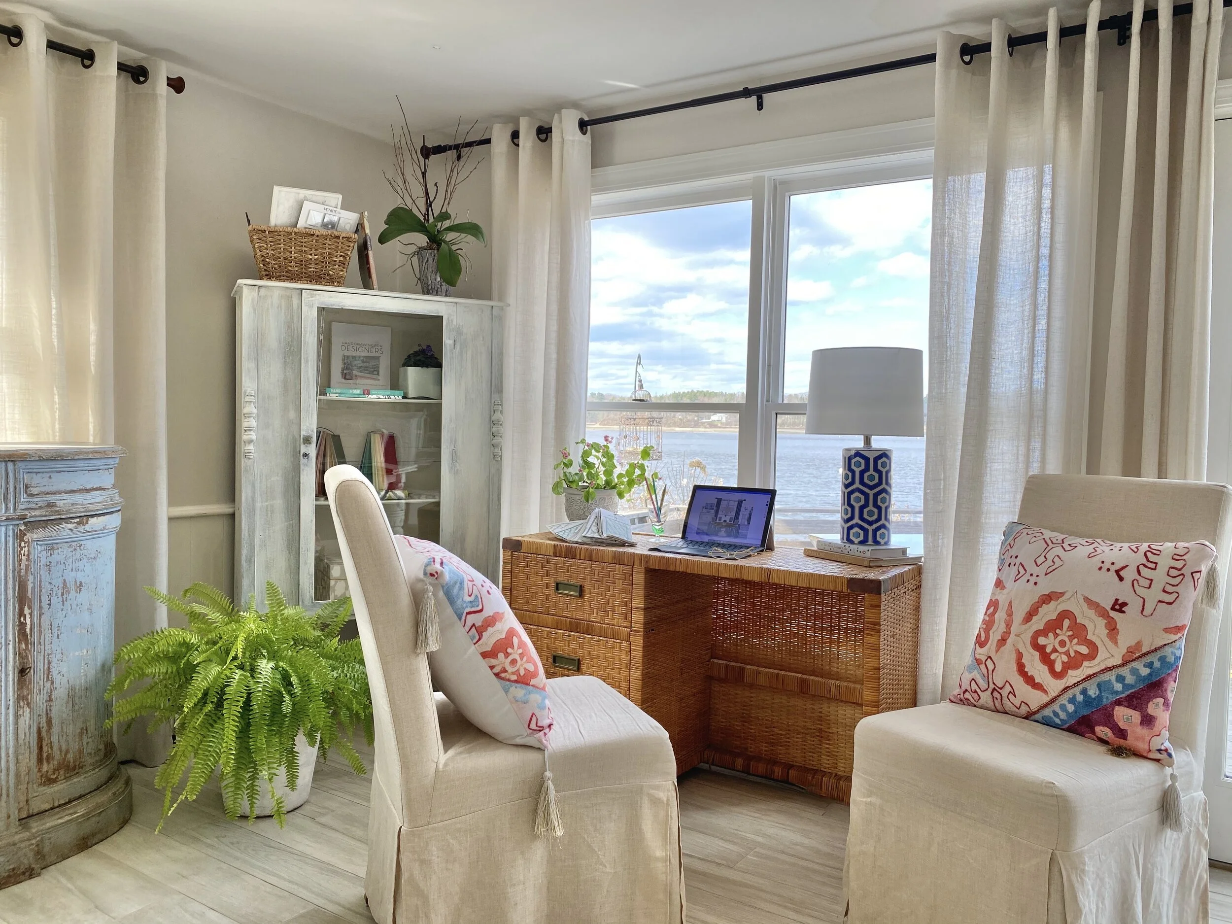 Shopping the home consists of walking through your home and taking inventory of items you would not typically think of using in a home workspace or office. This is just one of the design aspects I teach my students. For example, your attic might have a little desk, a chair, and a floor lamp with a small bookcase. The basement is another place where we tend to store unused furniture and accessories that would work in your new home workspace.
